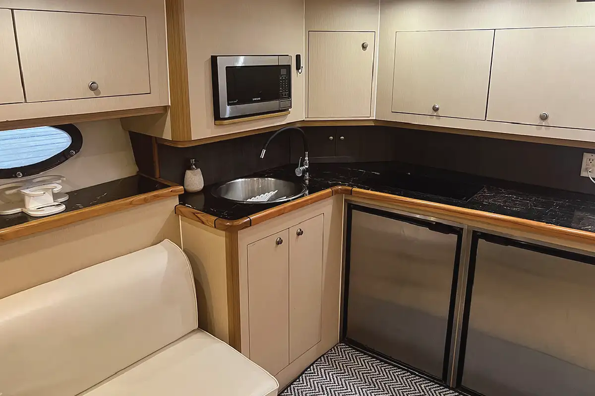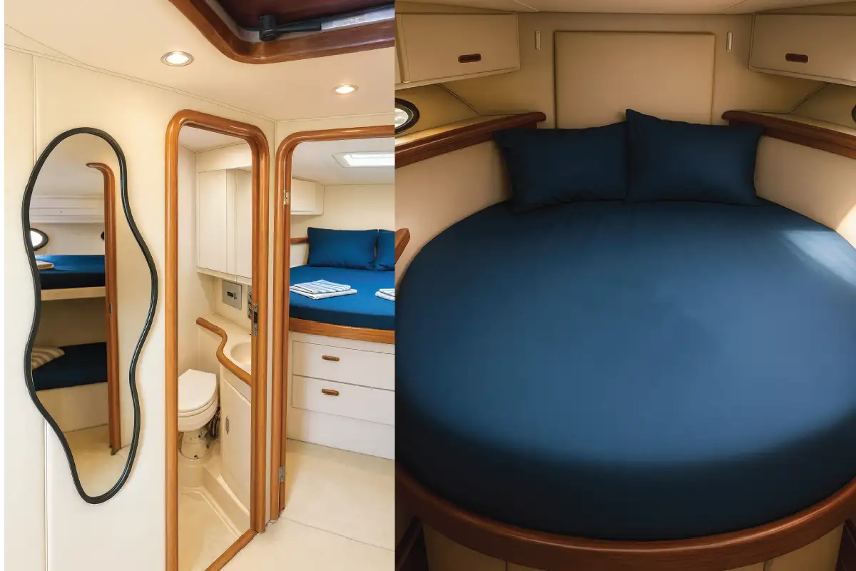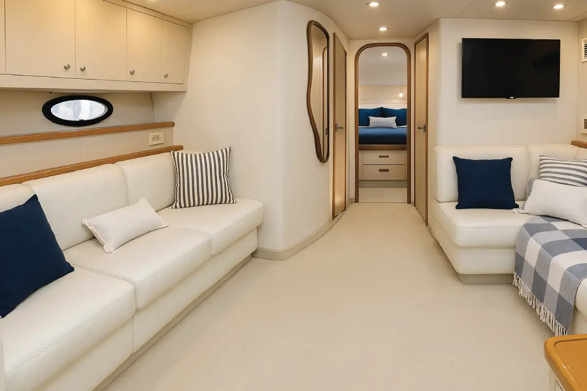 Confort real de yate premium: suite principal, baño, camarote, sala y cocina. Ideal para salidas privadas con experiencia completa.